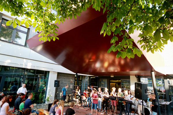Ein herrlicher Sommerabend, Sitzen im Freien … und v.a. gute Musik! Das gab’s beim Open Air vor unserer Schule am 17. Mai. Die Big Band in Kooperation mit dem Borg, unter der Leitung von Mag. Fritz Kronthaler, lud gemeinsam mit den Bands der 7M und 8M zum Konzert.
