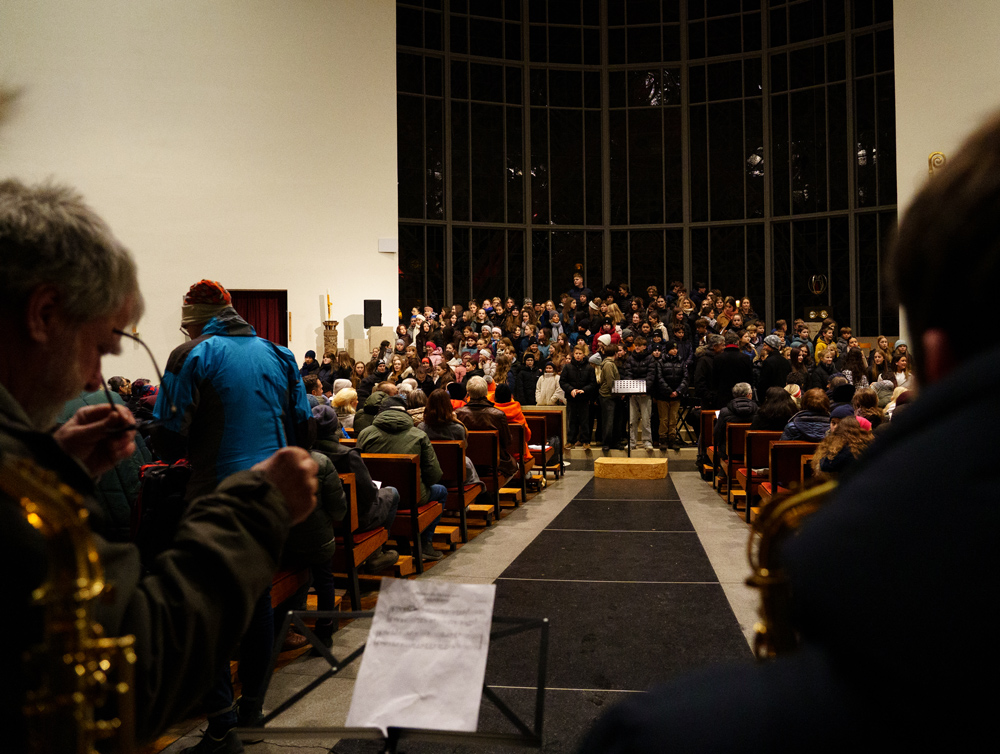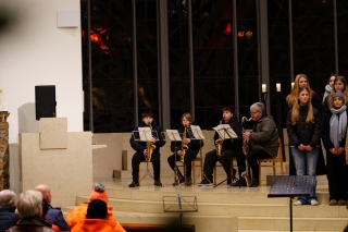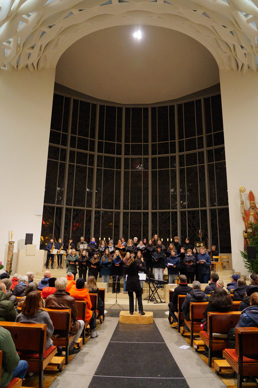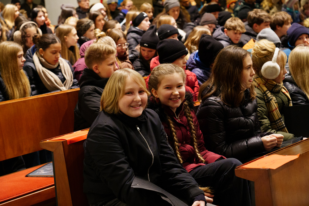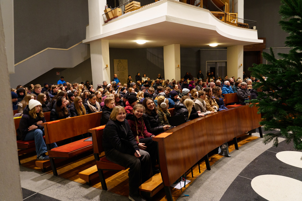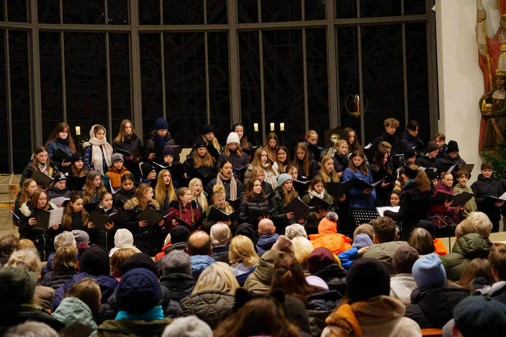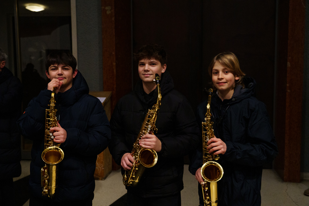 In der vollbesetzten Kirche Herrnau versammelten sich am 17.12.2025 alle Schüler:innen des SUM, Schwerpunkt Musik. Der gemeinsame Chor mit weit über 100 Schüler:innen eröffnete mit einem Kanon „Machet die Herzen weit und die Ohren für die Welt auf, dass die Liebe und das Licht einziehe“. Dieses Motto hat den Abend geprägt, Saxophone und Bassklarinette, Geigen und Flöten, ein Zauberharfen – Gitarrenensemble, Klaviersolo mit Musik einer Maturantin, Vokalgruppen aller Klassen, Oberstufenchor, Solist:innen und ein berührender Dreigesang der Geschwister Ziller. All das hat sich zu einer Reise zusammengefügt, durch die uns Melia Hermentin und Jelena Runge moderierend geführt haben. Herr Direktor Gaderer ist sehr persönlich auf das Gesungene eingegangen, auch auf die „Wachsamkeit“, die besonders in der Musik von Johann Sebastian Bach tiefgehend zum Ausdruck kommt.