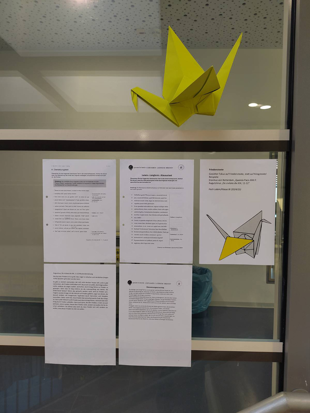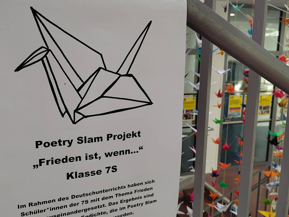 Eine Installation mit 1000 Kranichen ist das Herzstück der Ausstellung „Frieden ist, wenn…“ – zu sehen seit dem Tag der offenen Tür am 28.11.2025 im Stiegenhaus unserer Schule. Origami-Kraniche symbolisieren in der japanischen Kultur den Wunsch nach Frieden und Glück. Aber es zählt nicht allein der Wunsch. „Frieden ist, wenn …“ Darüber machten sich am SuM-RG Schüler:innen in unterschiedlichen Fächern und Klassen Gedanken. Ihre Projekte sind ausgestellt bzw. finden sich auch hier zum Nachlesen bzw. -hören.