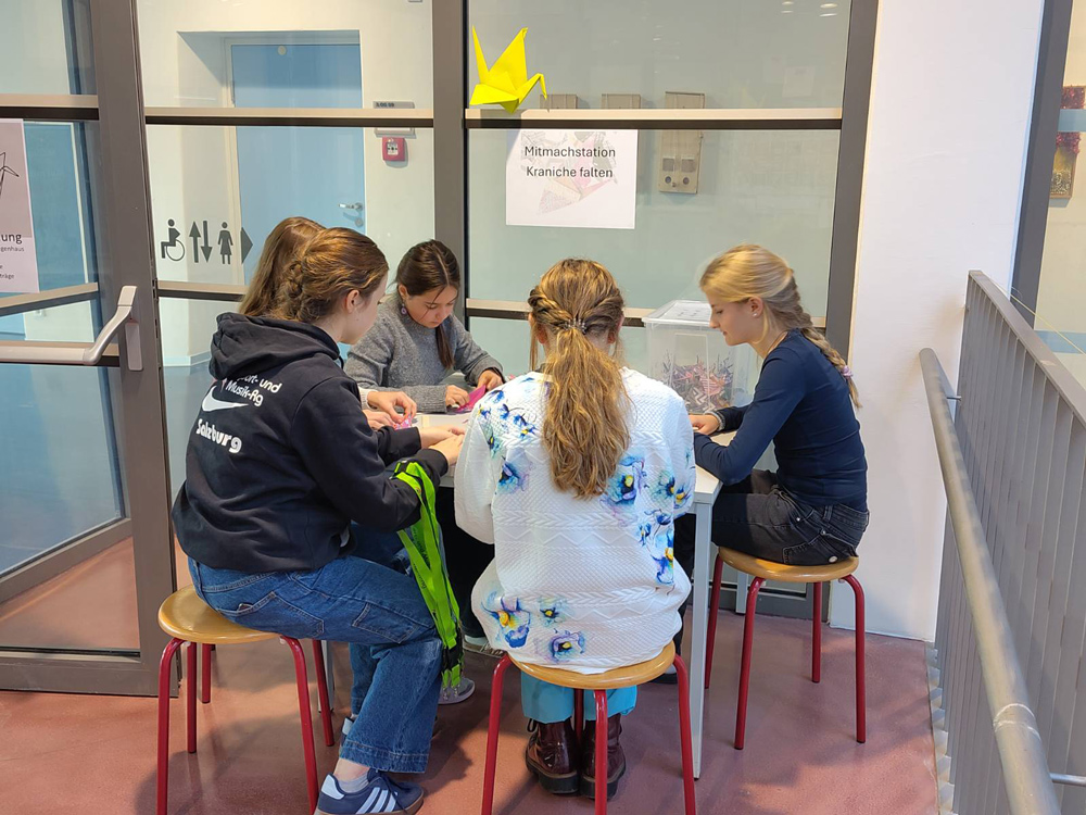 Dieses Friedensprojekt wurde von Frau Prof. Polacek initiiert und geleitet. Gemeinsam mit der Klasse 4m und Frau Prof. Juen erarbeiteten sie die Installation 1000 Kraniche. Aber beim Falten der Kraniche halfen viel mehr Schüler:innen und Lehrer:innen mit. Besonders engagierte sich die 1M Klasse bei der Umsetzung! Dabei erfuhren sie auch die Geschichte der 1000 Kraniche. Das Salzburger Friedensbüro widmete die Herbstausgabe 2025 seiner Zeitung Kranich diesem Projekt: „Frieden ist, wenn …“(pdf)