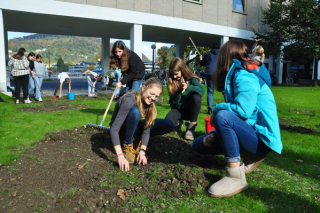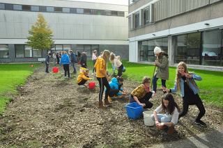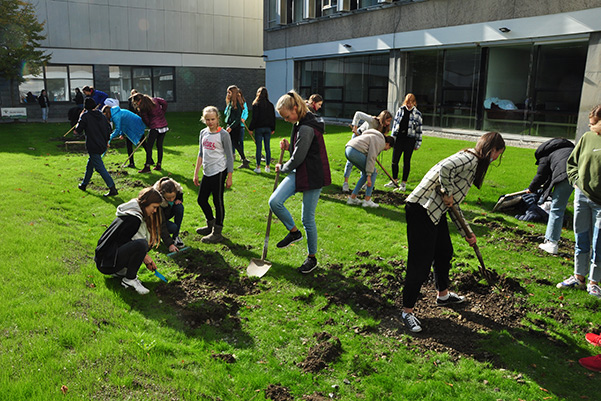 Nachdem die Baustelle der Nachbarschule im Sommer abgeschlossen wurde, kamen Ideen für eine neue Schulhof- und Gartengestaltung auf. Vor die südseitig gelegenen Klassen wurden Bäume gepflanzt. Eine „Schmetterlingshecke“ wurde angelegt und im Schulhof soll eine Blühfläche eingesät werden. Dazu musste die Rasendecke abgetragen werden. Mit Begeisterung machten sich die 4M und die 2MS ans Werk. Unterricht im Freien – was für eine Freude in diesen Coronazeiten! Doch der Umgang mit einem Werkzeug will auch gelernt sein und so manche spürten wohl, dass körperliche Arbeit auch anstrengend sein kann.