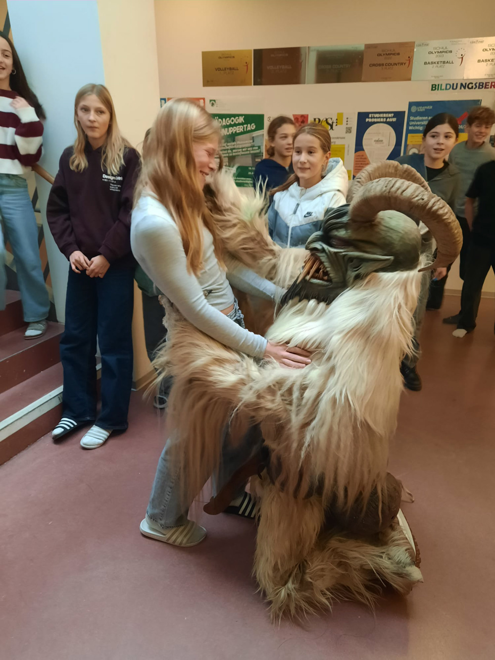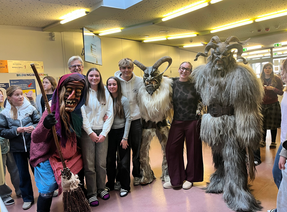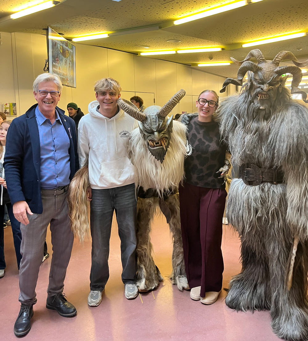 Klirren, Läuten, Kuhglocken: So kündigte sich am 4.12.2025 besonderer Besuch an. Die Perchten der Fischerpass aus Maxglan sorgten im Erdgeschoß für willkommene Aufregung, weiter rauf ging’s aber nicht, so die Abmachung. Darüber wachten nicht nur unserer Direktor, sondern auch der Obmann der Fischerpass, unser Buffetier Mario Riedel.